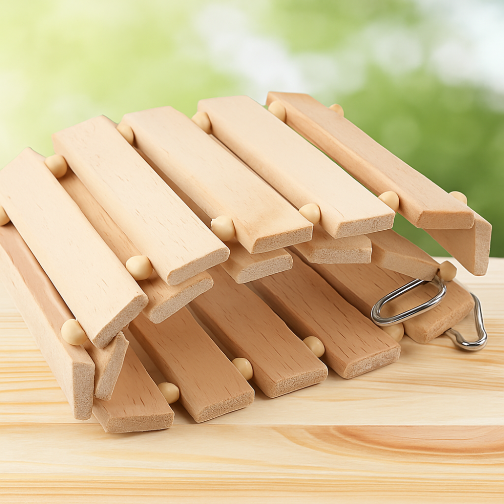 Fabricada em madeira natural, contas divertidas e aço inoxidável, este baloiço desperta os instintos de :
