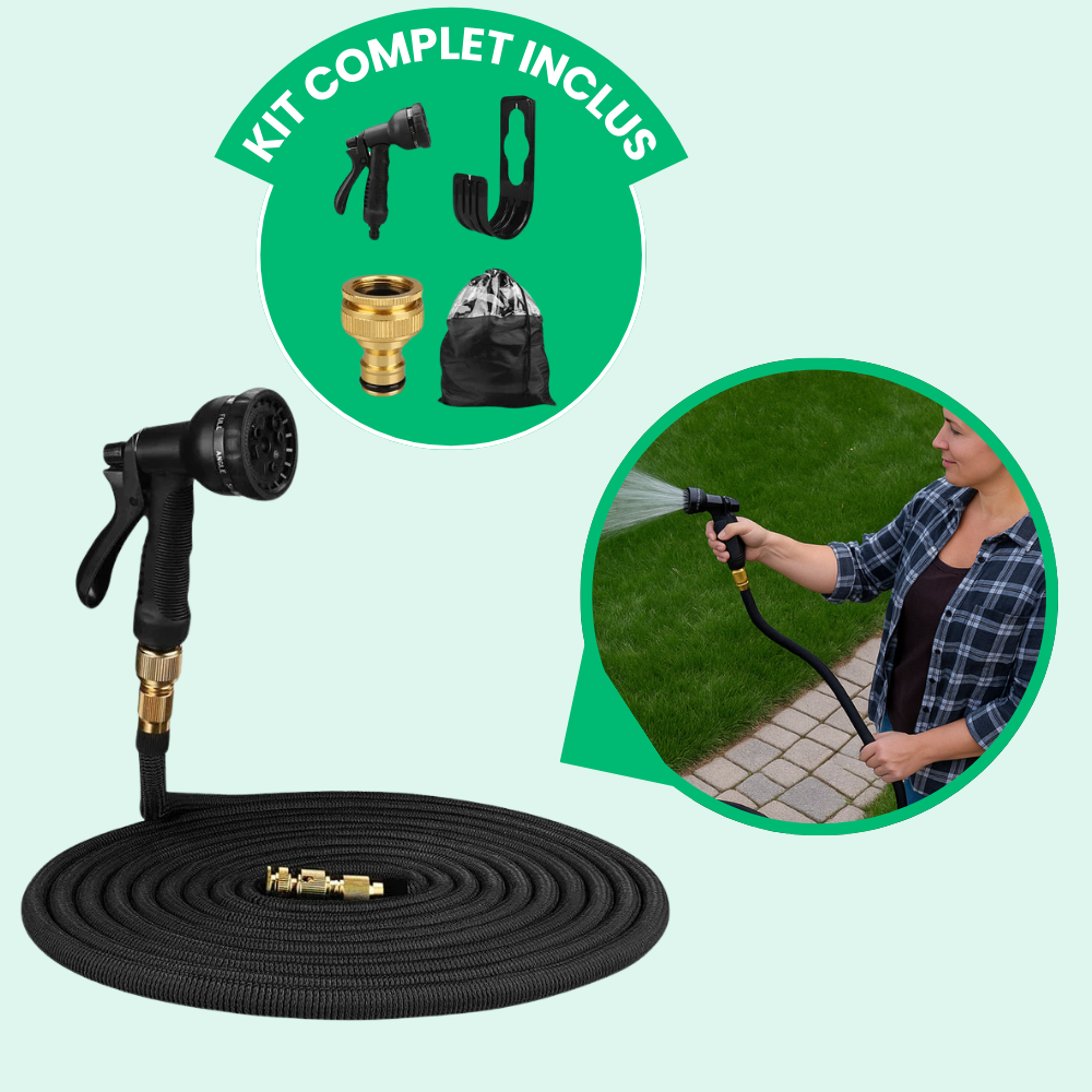 A mangueira expande-se quando está cheia de água, oferecendo-lhe um comprimento suficiente para atingir todas as áreas do seu jardim ou carro. Uma vez vazia, retrai-se, permitindo um arrumação fácil e sem desordem.